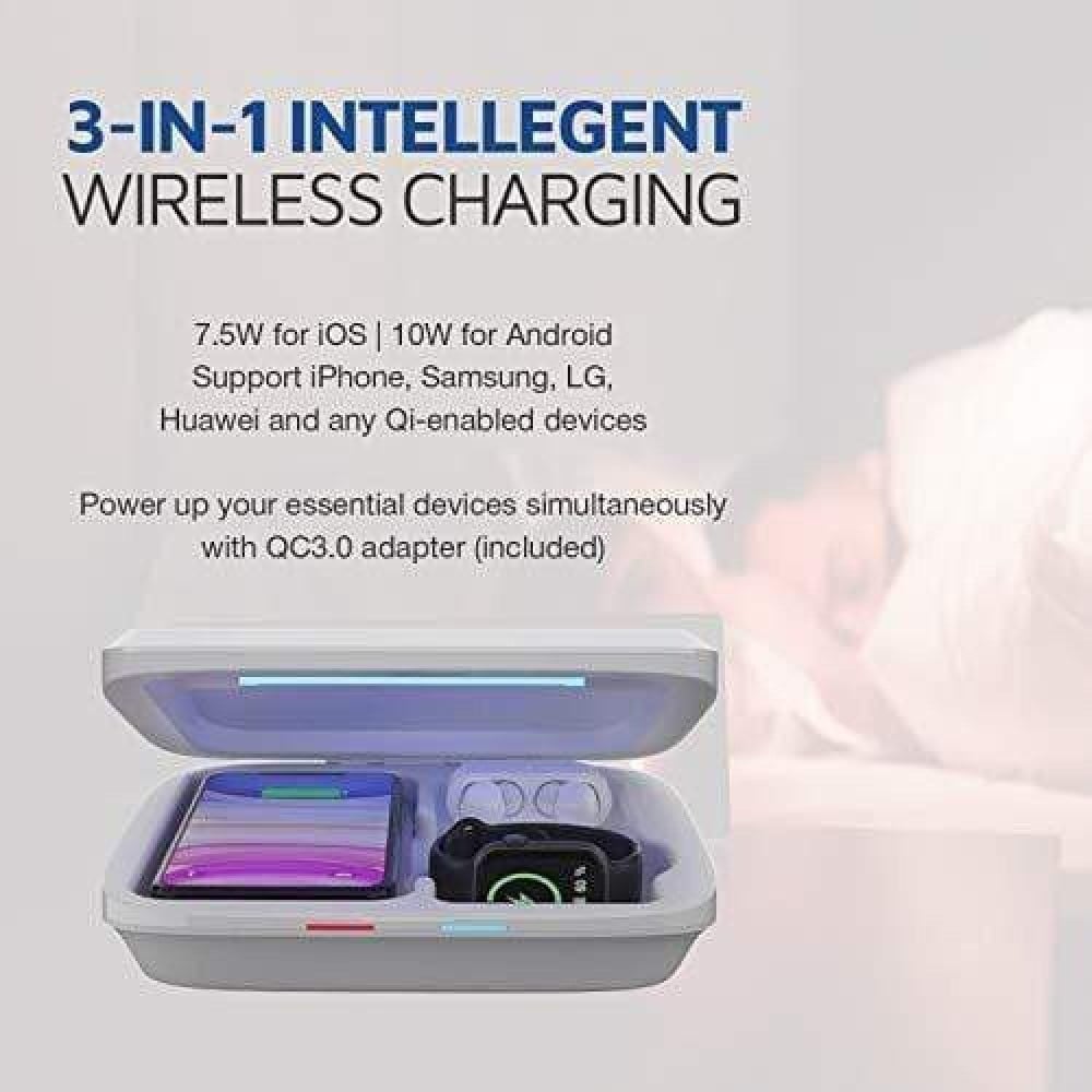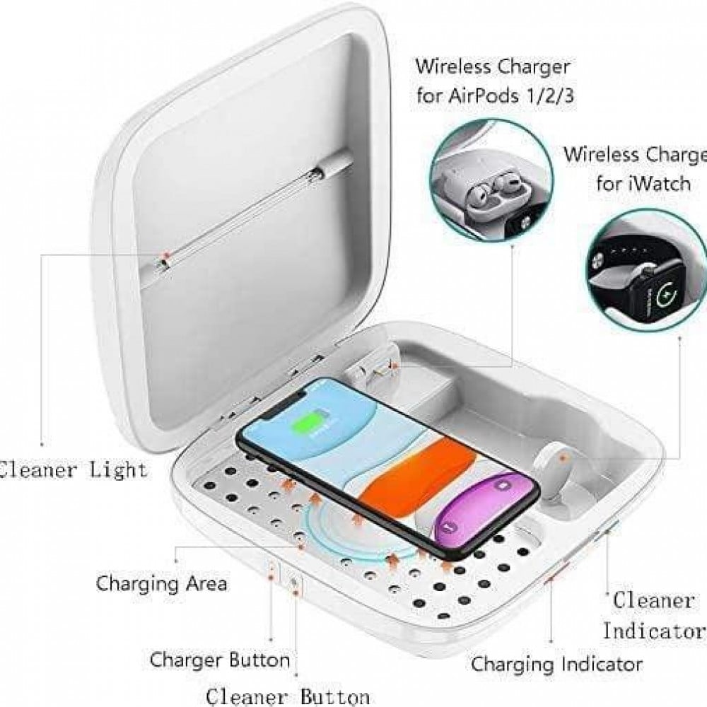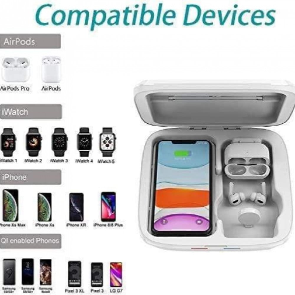 الأشعة فوق البنفسجية المطهر 4 في 1 شاحن لاسلكي للهواتف الذكية Smartwatch سماعات الأذن متعددة الوظائف محطة الشحن الهاتف الخليوي .
