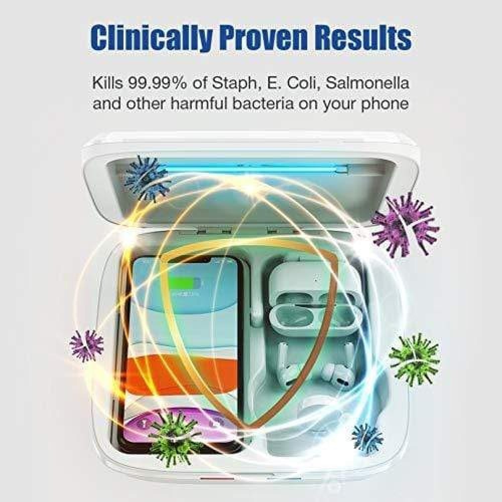 الأشعة فوق البنفسجية LIGHT SANITIZING: يزيل ضوء UV-C الثوري الذي يصعق البكتيريا الجراثيم بنسبة تصل إلى 99.9٪ في 3 دقائق. تحييد الكائنات الحية الدقيقة التي تخفي في الشقوق التي يصعب تنظيفها عن طريق المناديل. حماية نفسك وأقرب المقربين إليك عن طريق تعقيم الهاتف والأشياء الأخرى بانتظام.